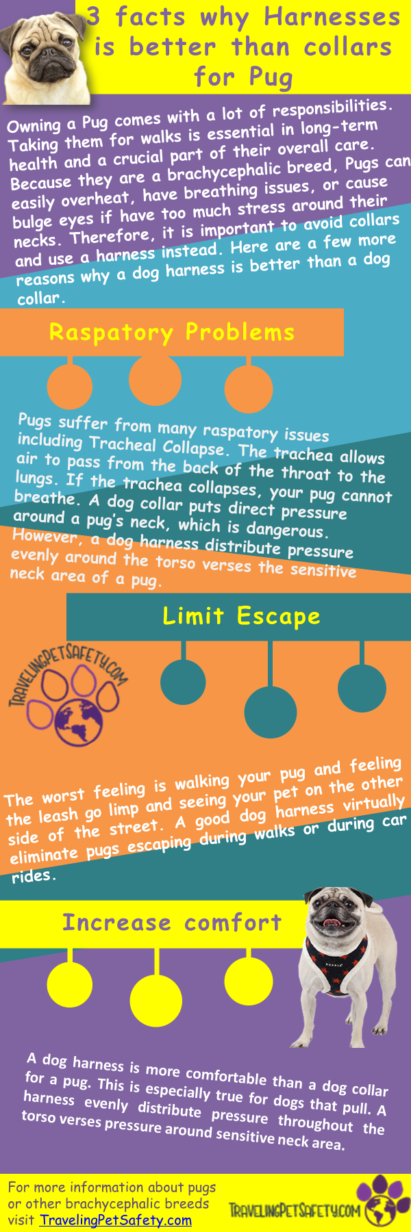 Dogs with similar nasal passages as the pug can also have a narrow windpipe, or trachea, which can put them at higher risk of a collapsed trachea. Their bug-eyed appearance is a result of shallow eye sockets. Using a harness instead of a dog collars keep pressure off their necks, which decreased pressure on their trachea and eyes.